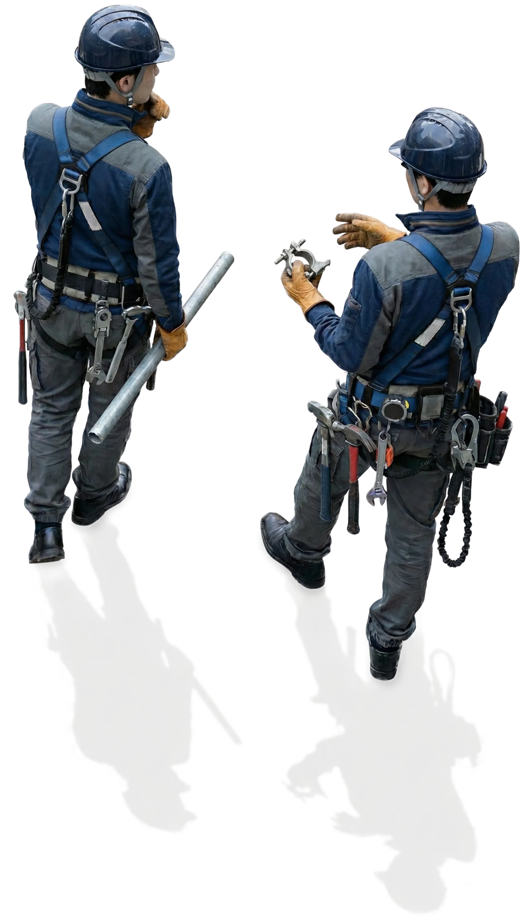 スピード、フットワーク、そして対応力。20代〜30代の若いスタッフが中心となり、 1段ごとに最適配置しながら、現場の効率を一気に引き上げます。1級とび技能士も在籍し、技術も妥協しません。